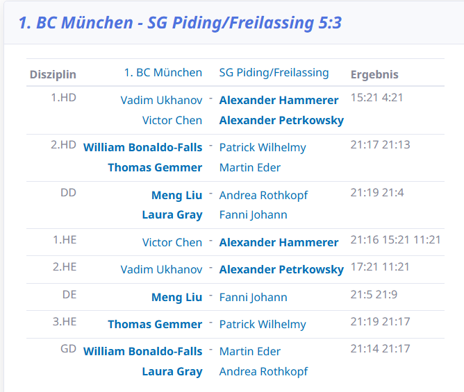 Das abschließende Mixed von Andrea und Martin gegen William B.-F. und Laura G. konnten die Münchner ebenso mit 21:14 und 21:17 für sich entscheiden.